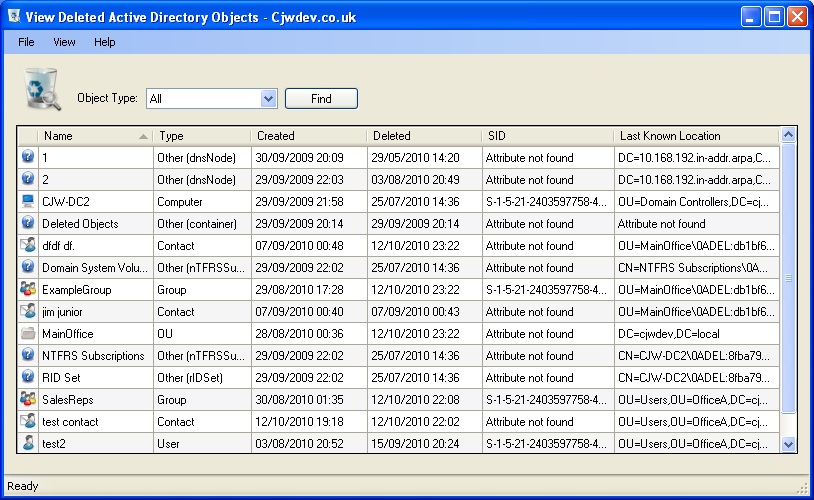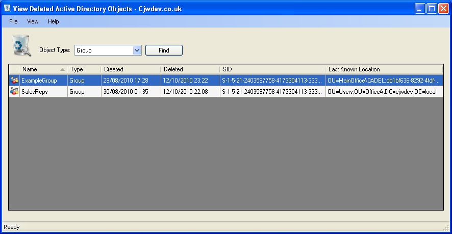 Use this simple application to quickly view deleted Active Directory objects that have not yet passed the tombstone period